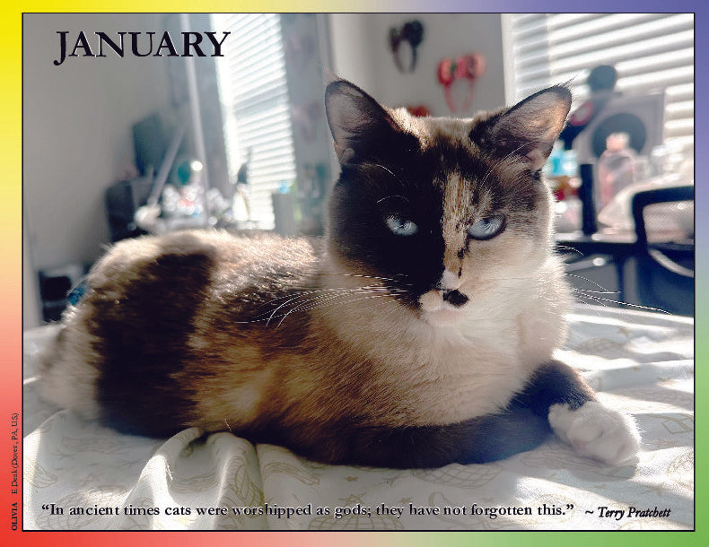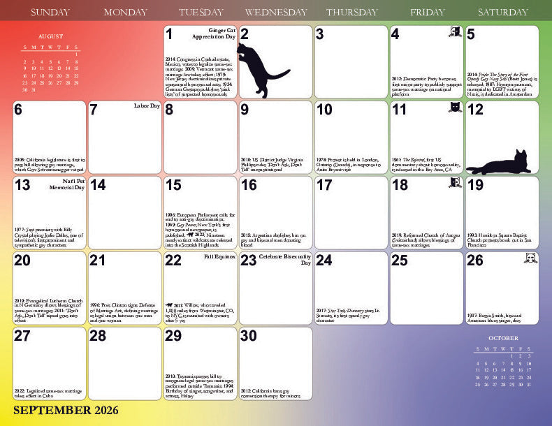 Cat Lovers for LGBTQA+ Rights wall calendar showcases historical anecdotes in a beautiful, full-color format with new rainbow theme.